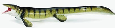 The Mosasaur will have a pale underbelly, a darker (in my case blue) back with black or white stripes for camouflage, matching flippers and tailend, and the long double-jawed head with large eyes.