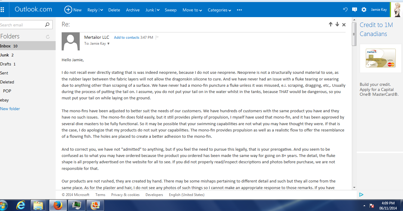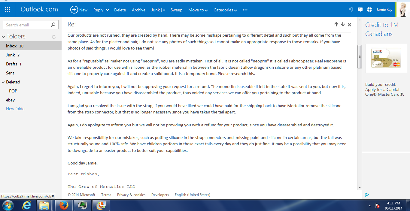 in the first set of emails He just keeps saying how pretty it is. Who cares? If it doesnt swim, why own it? Because he placed in crookedly inside the fluke it constantly pulled to one side. Making it very difficult to do anything in the water and thats dangerous. Im still getting the hang of this video editing/uploading to youtube thing, but I have a video MerMatt took and you can see the fluke folds almost in half when I put any force onto it.