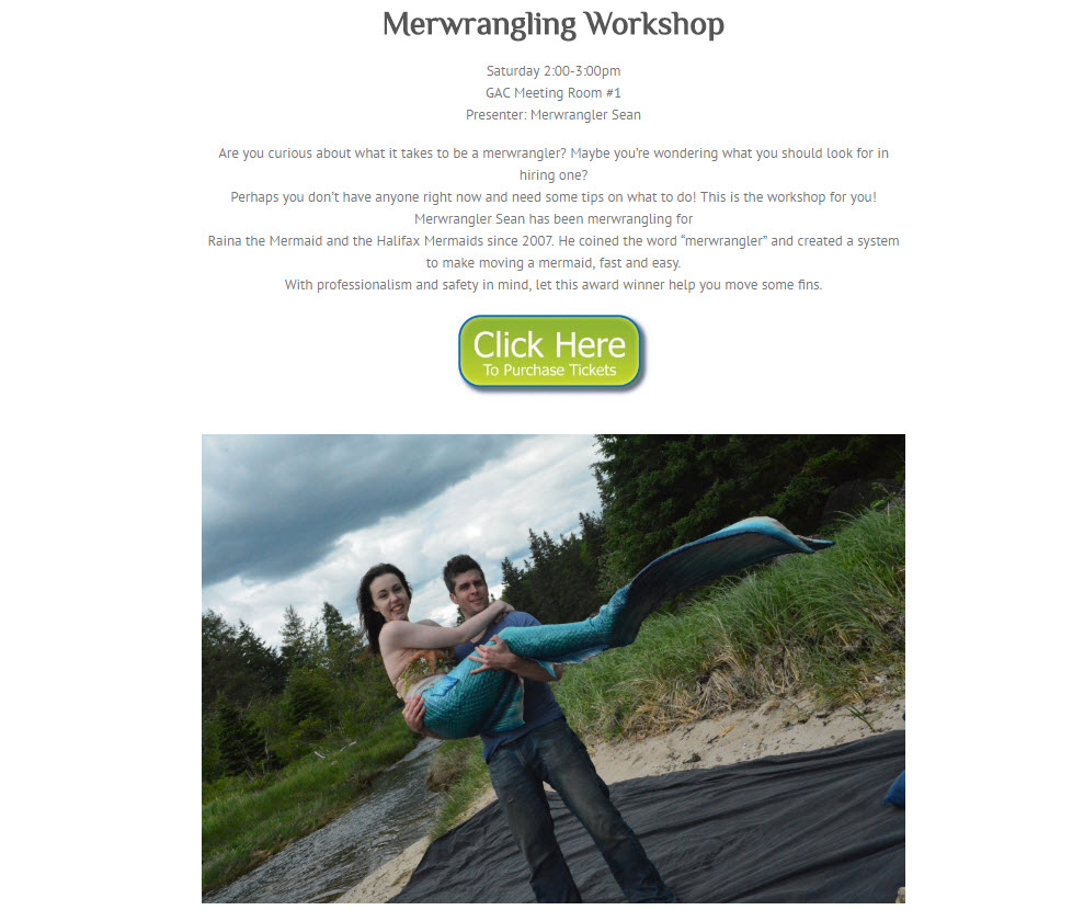 By popular demand... the merwrangling workshop! Merwrangler Sean of the multi-award winning Halifax Mermaids is going to talk merwrangling! From what to look for in hiring someone, what to do if you don't have one, and what to do if you are the merwrangler! Moving mermaids, safety, helping with the business and more.