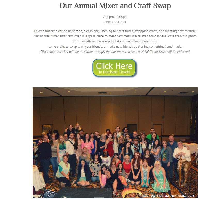 Join us again for a mixer and craft swap. Enjoy music with a DJ, get a professional photo taken by Shelli Craig Photography while you're all decked out, enjoy some great food, show off your crafting, and meet other mers! The mixer was a really fun event last year that allowed every one a chance to break the ice! Tickets are $15 (to cover cost of food + DJ) we hope to "sea" you there! ncmermania.com