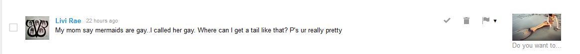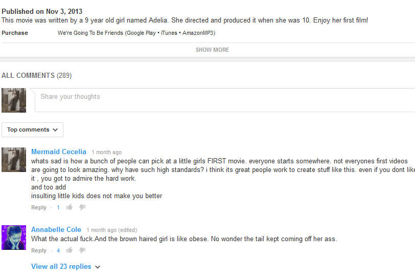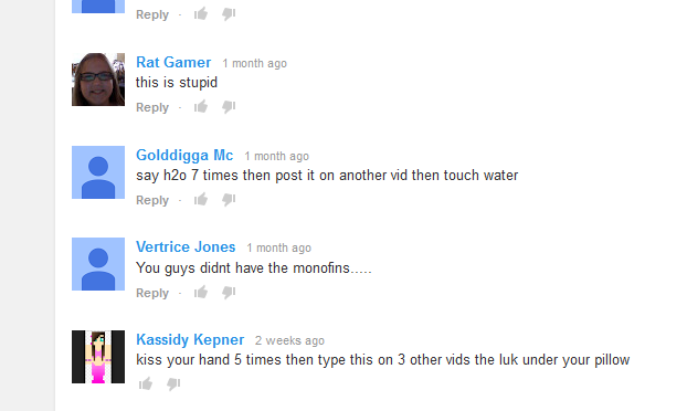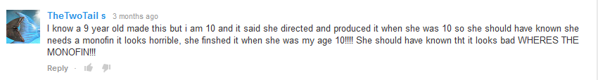 this is honestly the most repulsing thig, when you brought up youtube and how people take everything seriously i was reminded of this video , thats called " mermaid tails movie" which was a girls FIRST youtube movie video , so these girls are rather young but dispite that ive seen both weird, stupid and very rude comments