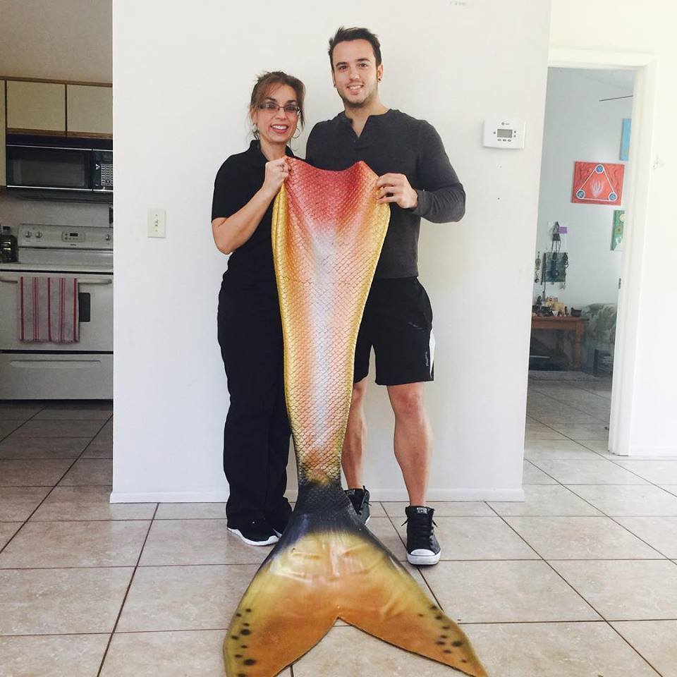 I asked what monofin was inside and Matt replied, "They're made of silicone with silicone foot pockets." I'm guessing they are like Mertailor's mermaid flipper except with that range of tail, the fin can't be removed. Cos that's what it sounds like to me.