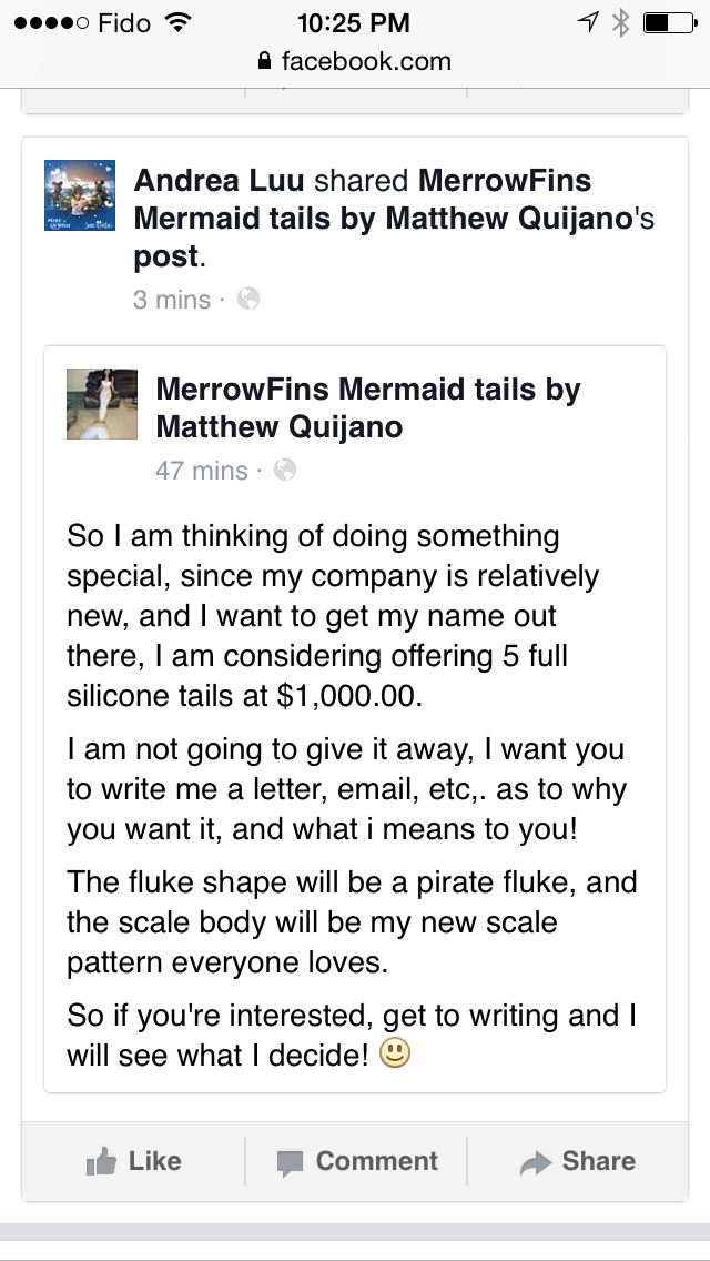 So, I was looking at his website briefly the other day and I noticed that one of the pictures that he's claiming as his work includes my stolen fluke design. I remember way back when it first happened that Mertailor claimed to have come up with the design on his own as a tail for his then boyfriend Matty. Now Matty is claiming to have designed and sculpted my original fluke? That doesn't sit well with me. (Quite frankly, the amount of material he is claiming to have done all on his own bothers me, too.)