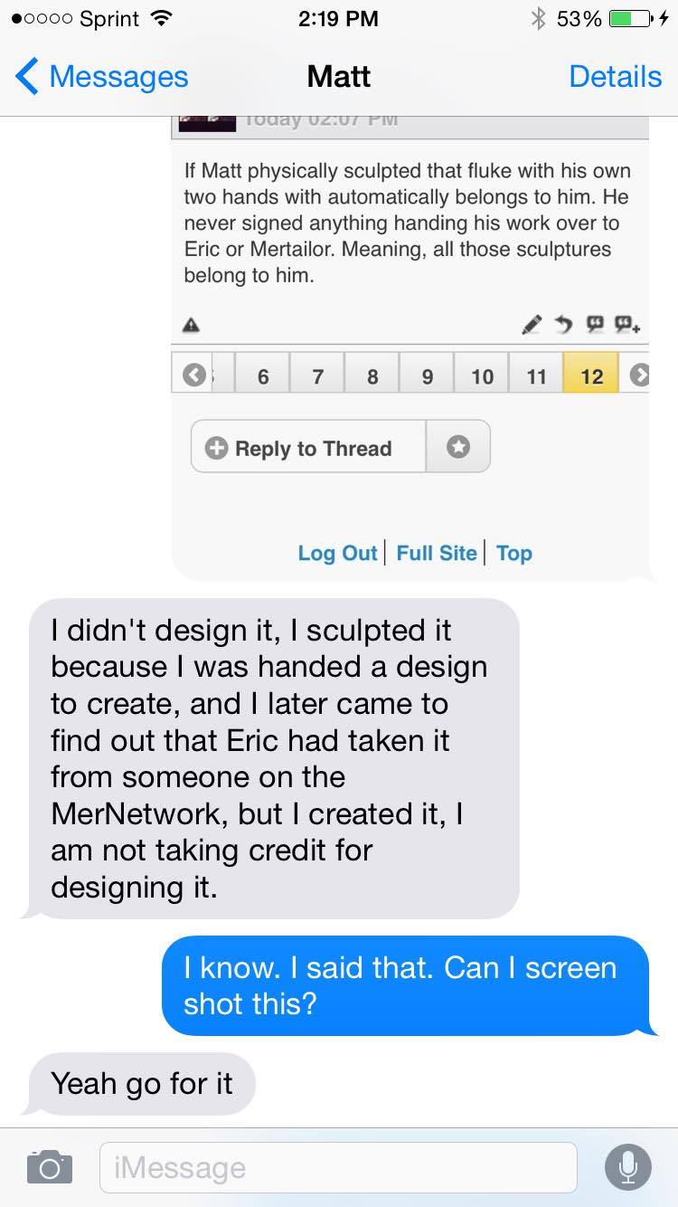 If Matt physically sculpted that fluke with his own two hands then it automatically belongs to him. He never signed anything handing his work over to Eric or Mertailor. Meaning, all those sculptures belong to him.