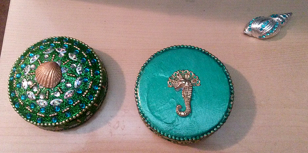 And just made this for birthday parties...got a little trinket box from Michael's for a dollar, removed the cheap velveteen inside liner and bottom and painted it, added some gold paint and a gold-painted shell at the top, and a little seahorse and gold doodad on the bottom to show it's "Atlantean treasure" :) We do a wishing game at princess parties with magic gems, so I figure I'll either put shells or pirate coins in this one for a mermaid version of the wish game! I also sealed it thoroughly so it can go in the water. it's still sort of white and gluey around the horse because it's not dry, but it will dry clear.