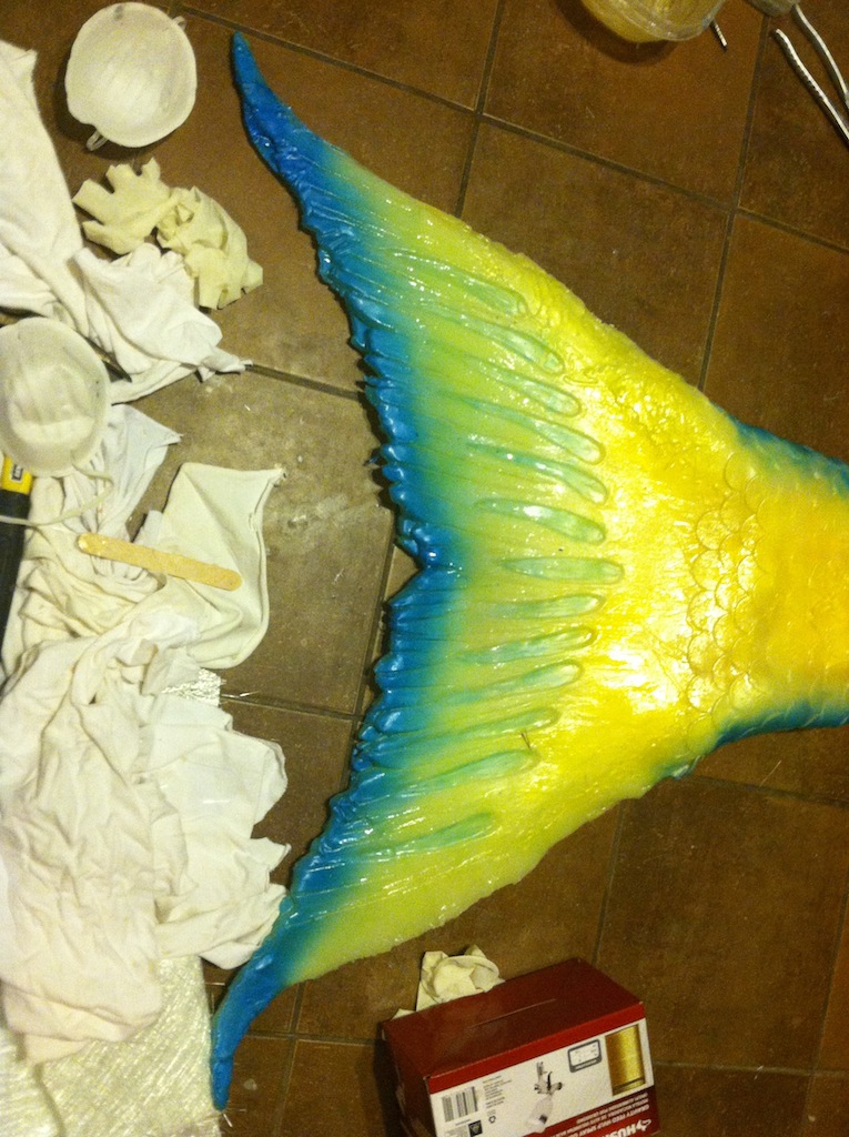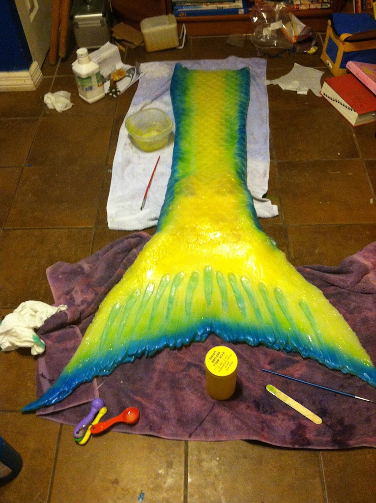 I just finished painting! WOOT! The tail is done! I repainted the front and made the the green color cleaner. I also painted the whole back this morning. I recommend using a spray gun to cover the most area of your tail. For little details I would say to use an airbrush.