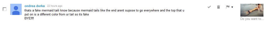 This person is so aggressive. BYE!!!!! lol! They must be mad because you crushed their dreams by not wearing a top that matches your tail. What do they mean by "taili know because mermaid tails like the end arnt supposed to go everywhere"? I honestly have no idea. BYE!!!:rotfl: