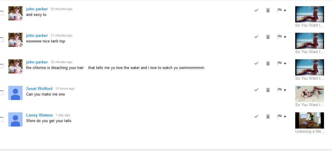 I always find it funny when they ask me on my video that says in the title "merbellas" who made my tail. lol Then we have this guy, wants to know who sean is and if he has to be there. LOL all those comments on vlogs of all things lol