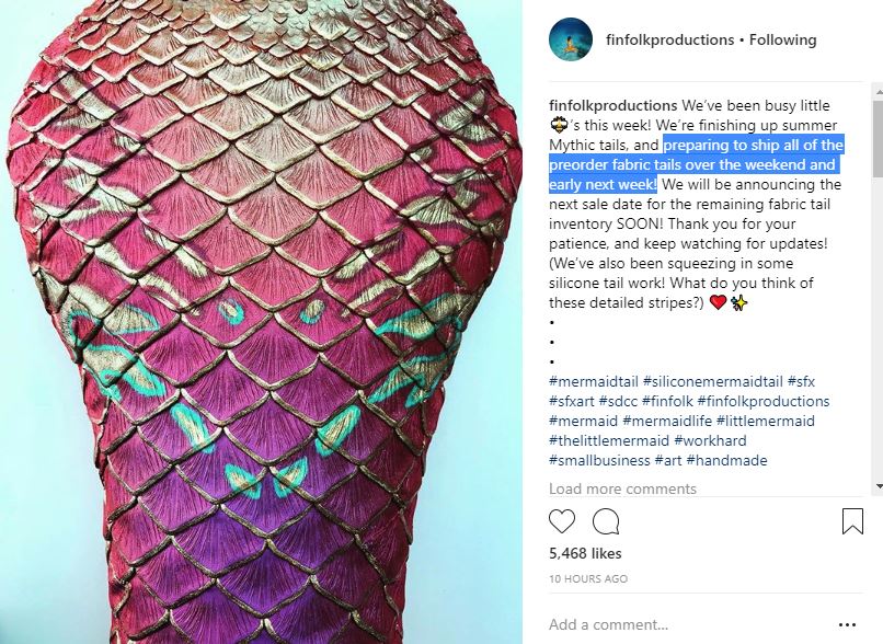 Anyone heard anything about the fabric tails? Last update was on Sunday saying that they were gonna start sending them out yesterday. So far, nothing, and people are still asking when they’re gonna send them out. My boss at my second job (a scuba shop) keeps asking when I’m gonna get my new tail so I can get in the pool with some of the classes, but I keep having to tell him that I don’t know because they keep having to delay the shipping.