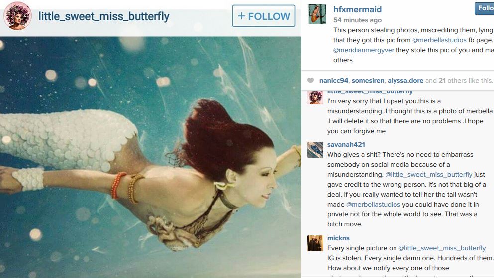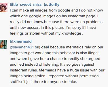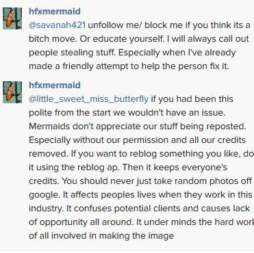 Now, when I approach people nicely and they dont listen I always reblog and tag the mermaids involved (because when you comment more often than not the OP just deletes your comment) as you can see from the comments on my screen shot the girl apologized and deleted all the stolen images. I appreciate people back tracking and doing the right thing, but it's frustrating to have to call them out publicly to get them to actually do it.