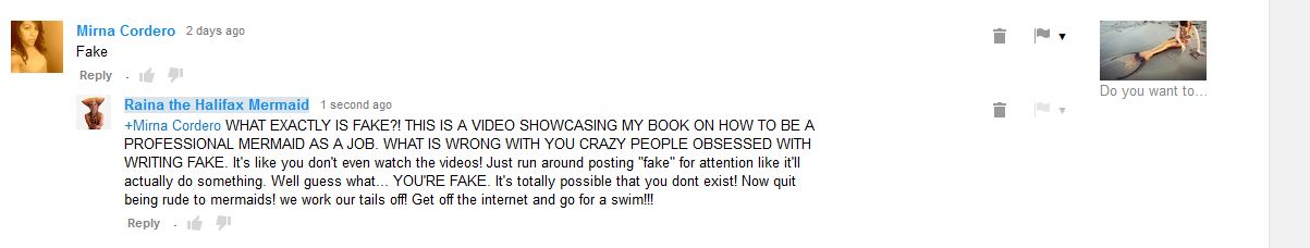 "Hello Iona. I hear you are a mermaid. Well I hardly believe that. Sorry if i am being rude but there are real live mermaids out there who think these videos and photos you have are very offensive! Please contact me back as we need to calm this riot down. Look, Iona I am just trying to protect my people. You can email me back anytime just PLEASE HURRY.
