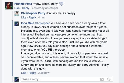 Hmmm. Well, I was going to try to make it to Mer-Mania, but as someone who has experienced stalking, harassment and sexual violence (not at this person's hands, but in my past) I don't think I will now. I couldn't go somewhere where people who perpetrate this kind of behavior are also welcomed.