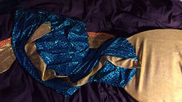 ^^ hello! I figured I should go with the flow and post my own fabric tail. I had a previous tail that was white with orange accents for a koi theme, but I'm liking this odd blue/green and gold blend that ended up much brighter than I expected. I have larger pectoral fins because being a bit larger myself I like having something that brings my size in context.