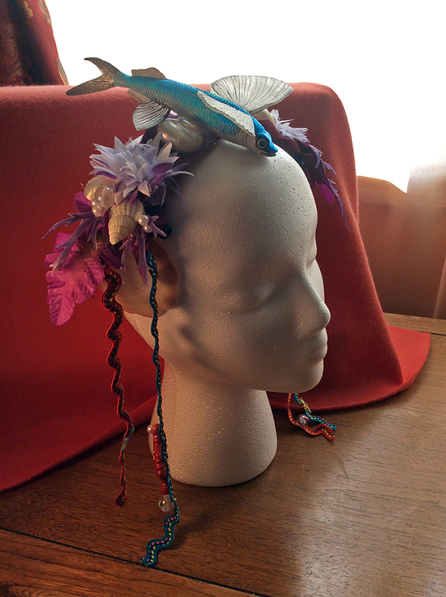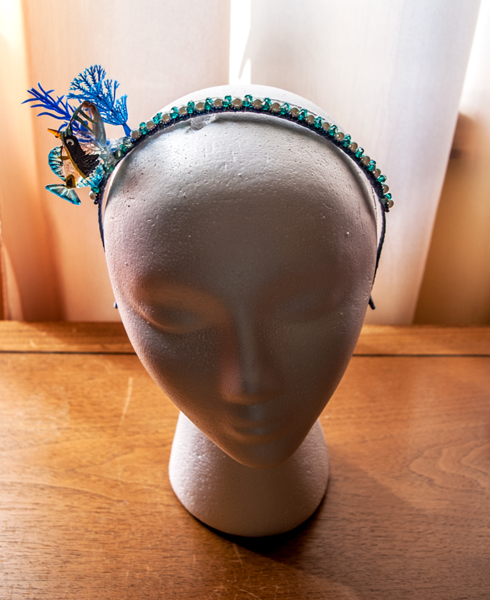 I picked up this little headband at Hancock Fabrics. It was already wrapped with beads and rhinestones; I just added the little fishie and seaweed. The fish is glass, so I will have to be careful not to bump it on anything!