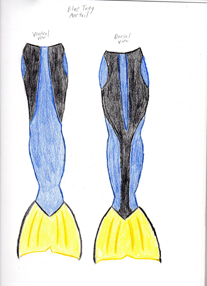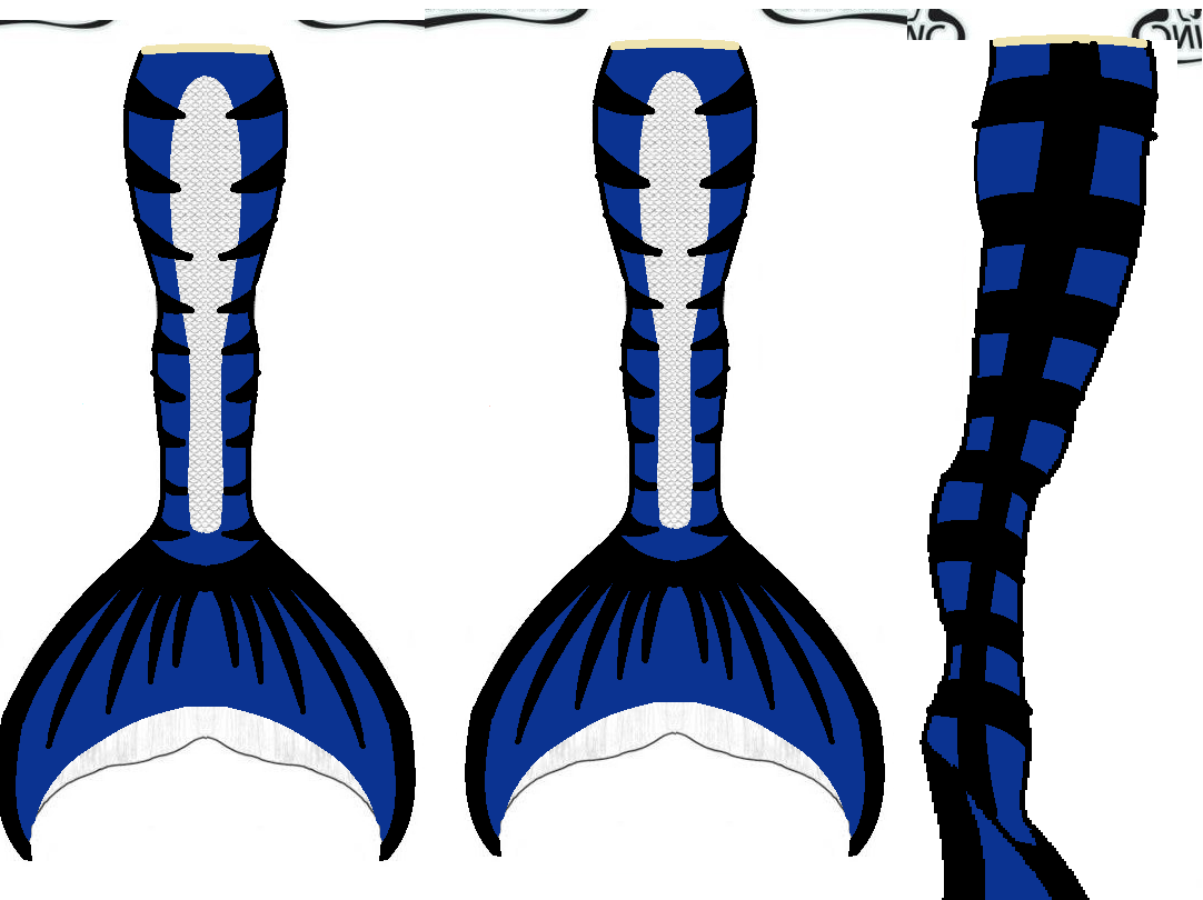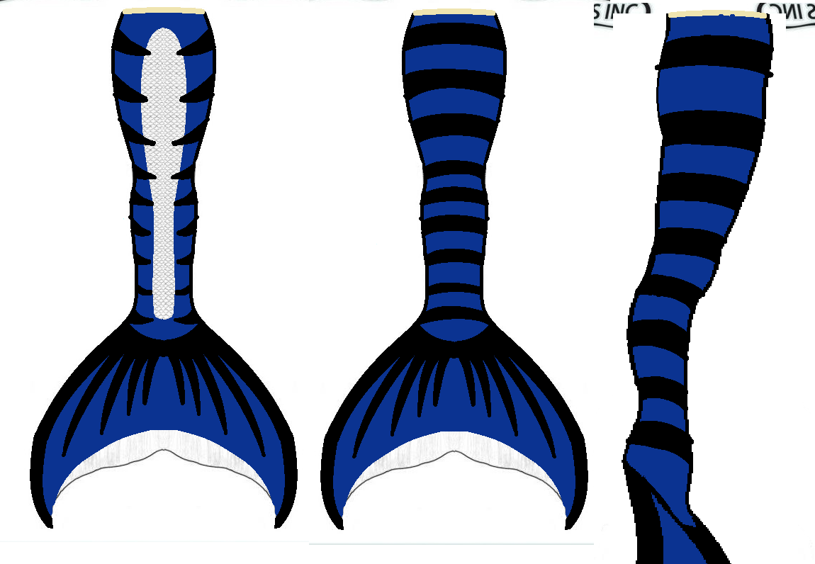 So, the first design is the prettiest from the back, which is the part you'll be able to see when I'm actually swimming unless I'm on my back, but I want a dorsal fin, which wouldn't really fit in right. Of course, i could totally do without a dorsal (I didn't even like them at all until recently), but I noticed when I was drawing up my design that the black striped look a lot like Ayla's tail, and I'm trying to avoid looking like someone else's tail, and since she has the same pattern on both sides, changing it up would help me look more unique, plus she has no extra fins. I also added more blue than i originally planned in order to avoid looking too much like Ayla (so sorry for having a similar idea Ayla, but I have my heart pretty set on the black stripes). I'm pretty set on pectoral and heel fins as well, and I think they'd look okay if I had them put right on one of the stripes and just started black so it was like they were growing out of the stripes, but i can't draw fins and don't even know what would be a good shape for them, so i left them off the tail, haha. I can draw much better by hand, but I don't have a scanner, and I can't upload pictures to the computer from my phone because technology has turned its back on me as of late.
