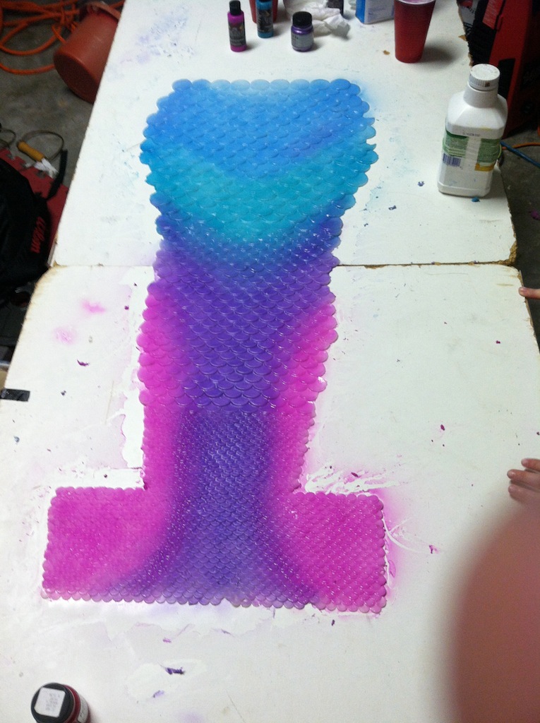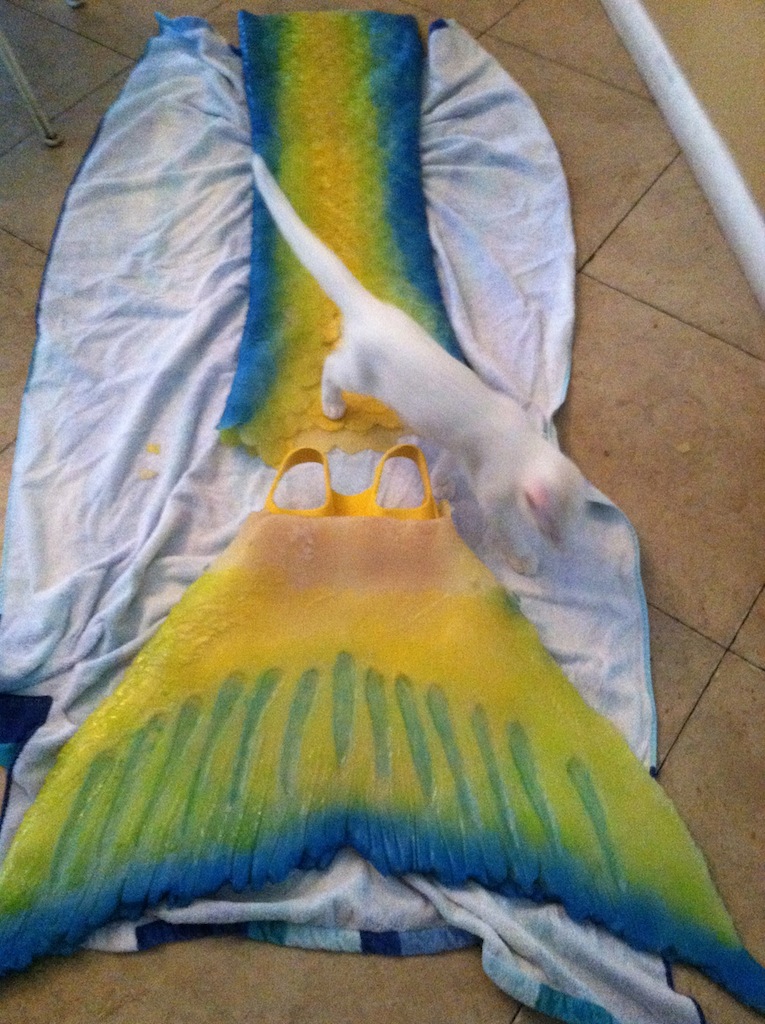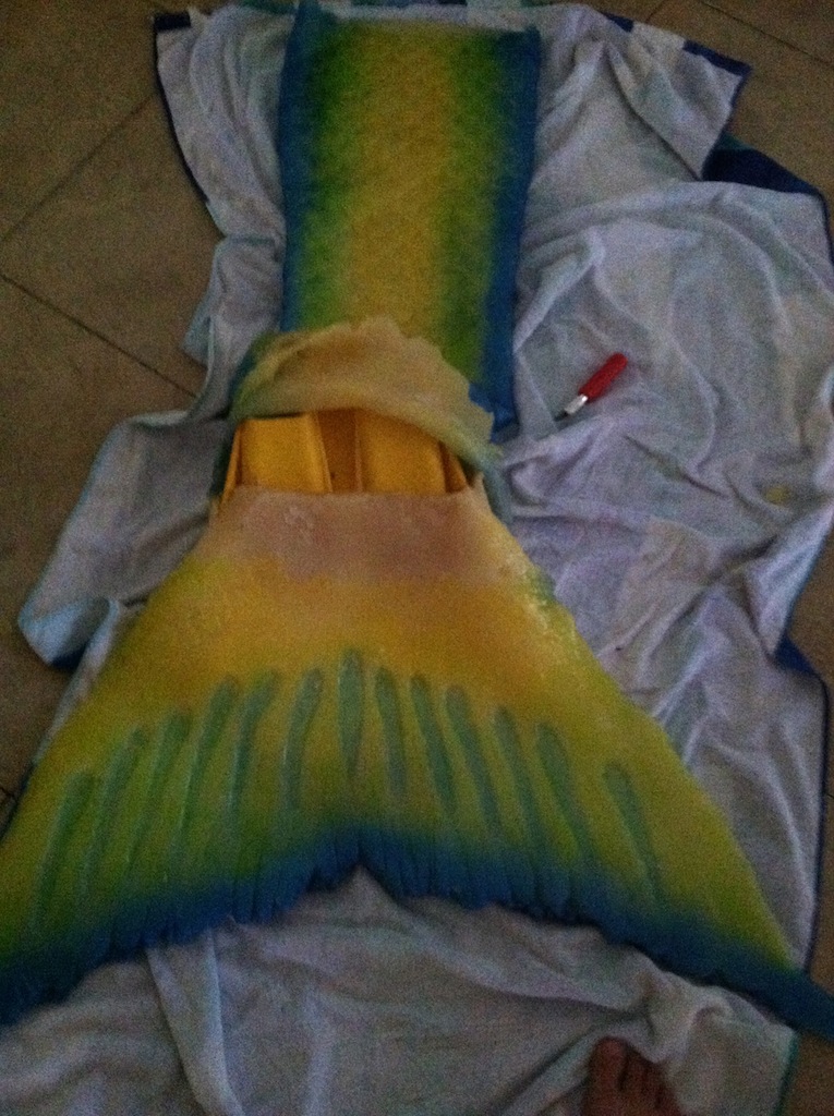 Tail repair. Adjusting the ankles to fit my size. I will repaint the tail sometime soon by adding some aqua and more green.