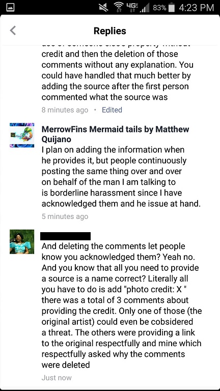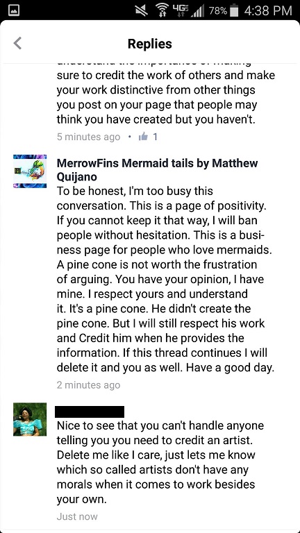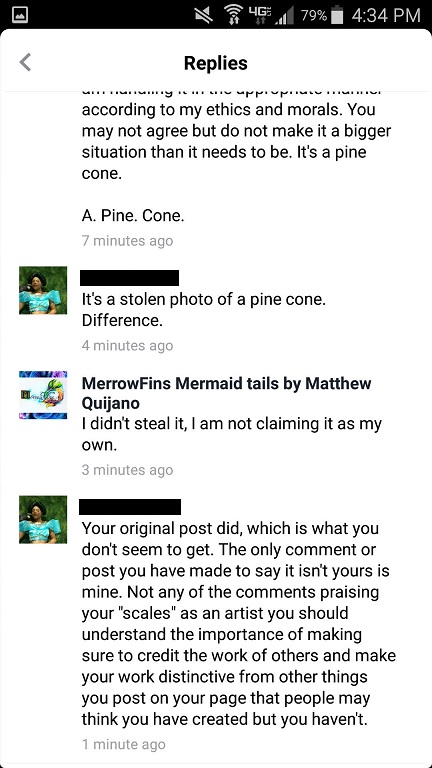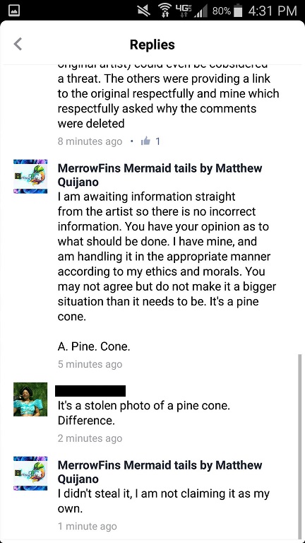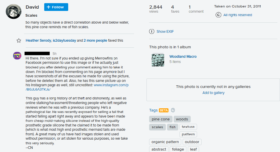 ... instead of deleting that comment, along with all other references to the original image... Then blocking anyone who had mentioned it (I've been blocked for my comments too, one of which you can see in Theo's screen caps. The other was simply replying to another persons comment saying nothing more than 'it's a pine cone'... Only a guilty conscious would consider that harassment!) and continuing to delete comments while claiming to have contacted the photographer and be waiting on his name(?!?) so he can finally credit the photo.