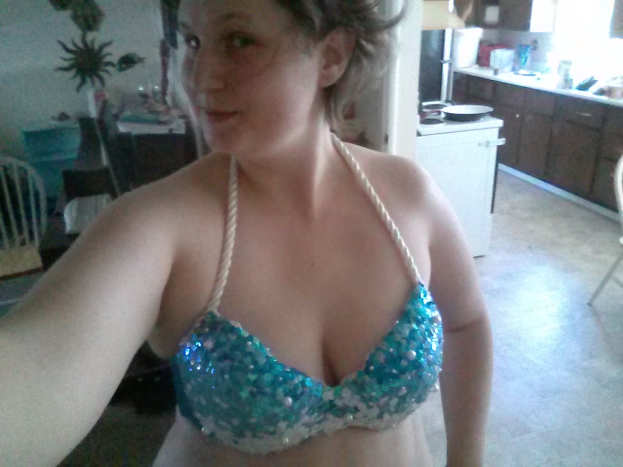 The top I made to replace the old one I made that didn't fit anymore and this one matches my tail that I'm about done with!!! :D I'm going to add a bunch of betting and pearls between the cups to cover some cleavage too. ;)