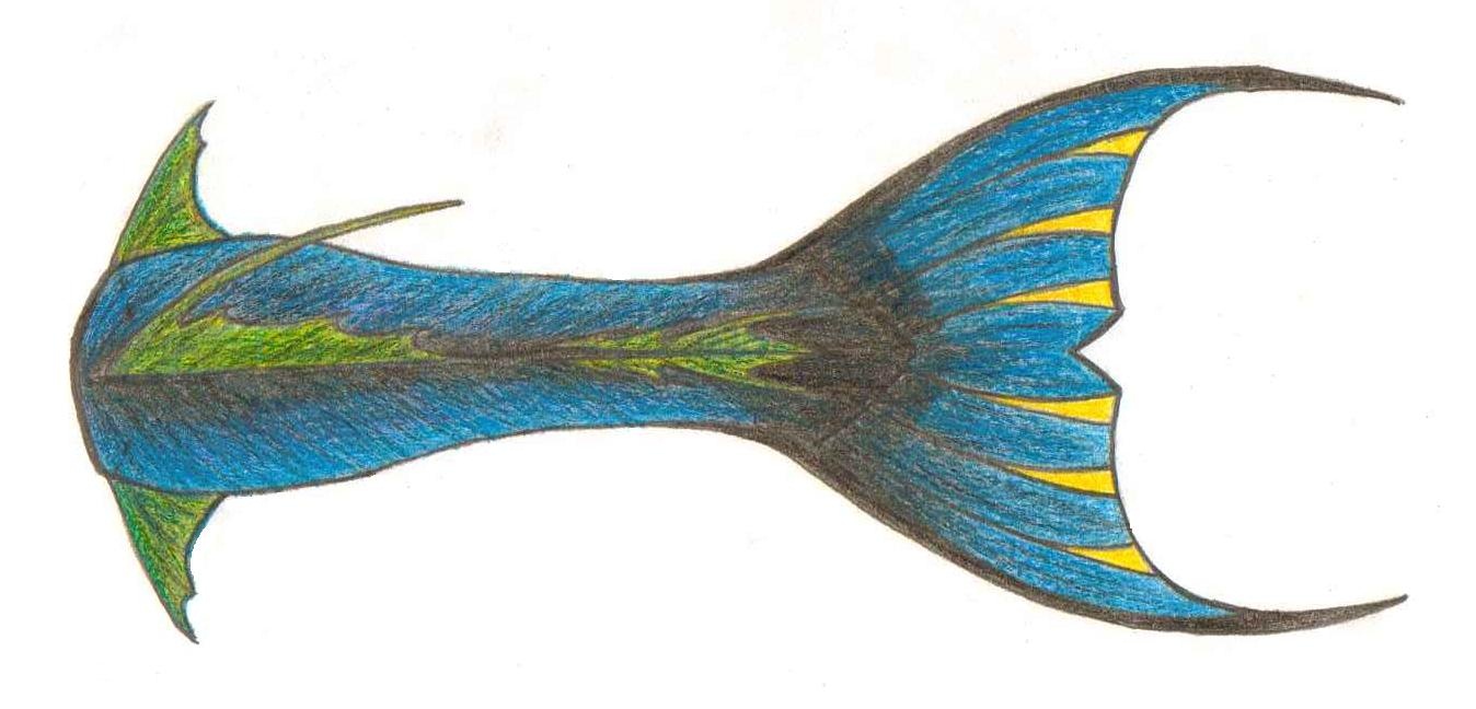 Here is the final color design for the ventral side of the tail. I've yet to color the final for the dorsal, but I'll get to that later tonight. :3 I realize the design has changed a good deal, but I just couldn't get comfortable with the last color scheme. And, in case you are interested, the blue in this picture was originally a lot more of a royal blue along the edges. I promise the whole picture is actually a lot darker and the yellow should be much more gold. Think jewel tones.