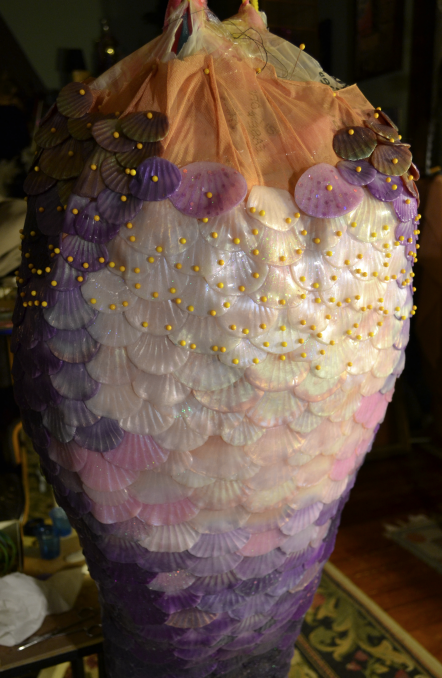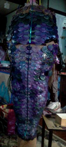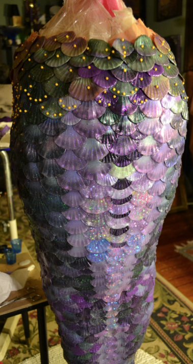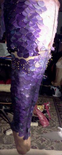 I'm up to the top of my legs! Each row takes about an hour, it's pretty slow going. But each scale has a matching scale on the opposite side. The line is a ribbon delineating my center line...next, new monofin construction and the application of the fluke!