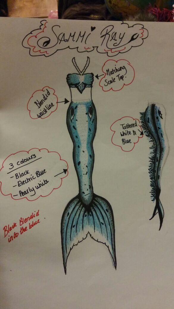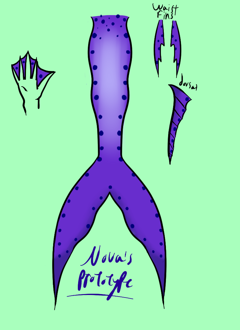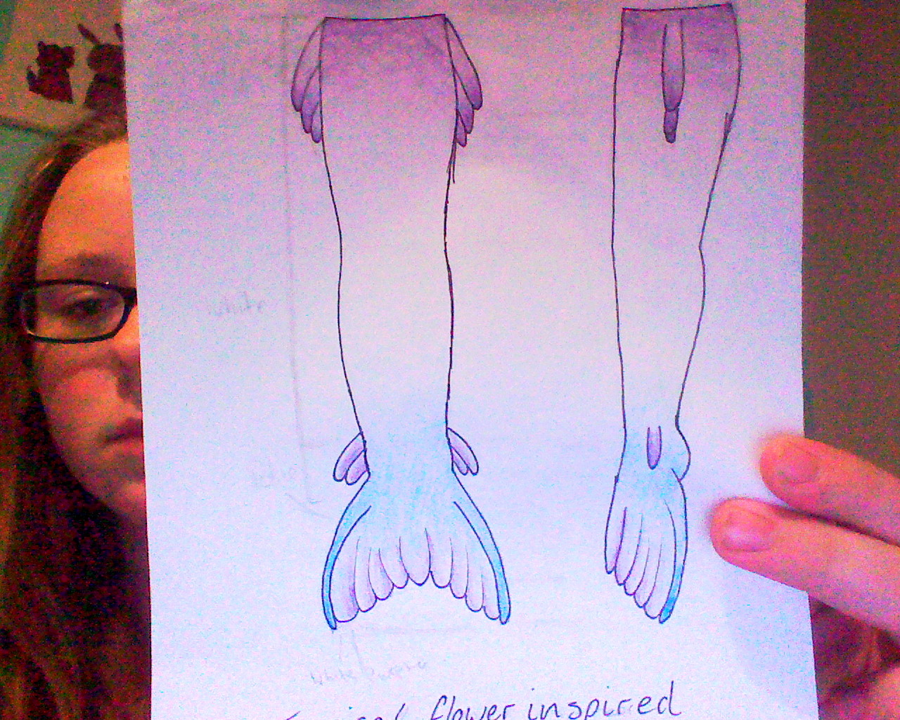 Attachment 26404 Attachment 26405These are my designs. The white and purple and blue one was based off a flower l found on Google, the second was just from my imagination. But l won't be making either of these because 1) I live in Ireland, so l don't have my own pool. 2) Because l don't have my own pool, l can't swim very often, and 3) My public pool doesn't allow monofins or flippers. Great...
