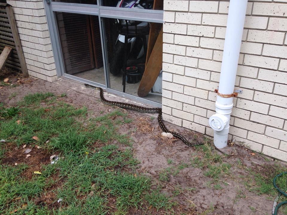 Well it probably came in from out the back, it is Australia and I've seen that sucker hanging out in the backyard before. We could have called animal control but it was the middle of the night and it would have cost a couple of hundred to get someone to come out. So we just crocodile-huntered it, put on all the bike gear and put it in a cat box and took it to the bush and let it go. (here's a photo of the same snake from a week or so ago in our backyard)