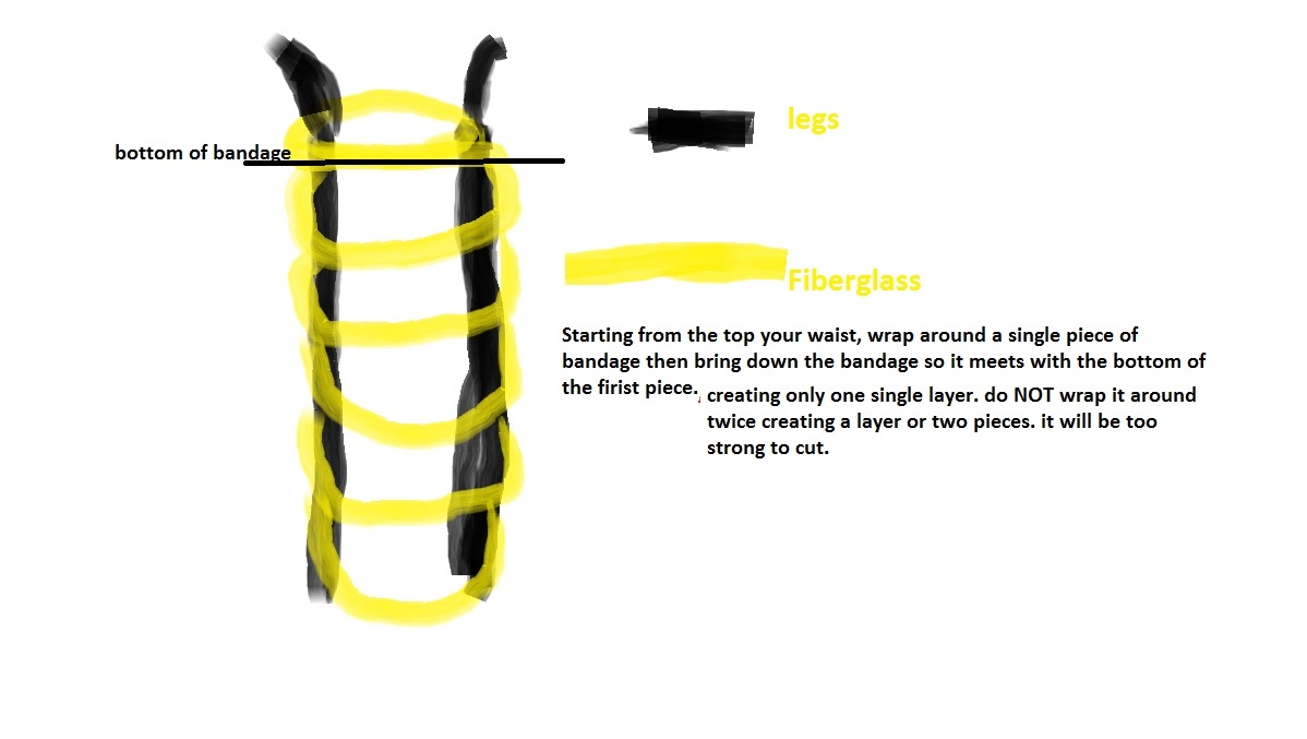 couple of things to remember. with water activated fiberglass you usually can only use it once. meaning once air gets to it, it will harden. found this out BTW. so when you wrap your legs, wrap in ONLY one layer otherwise you won't be able to cut yourself out. cut STRAIGHT down the centre of your legs (FRONT) I find this the best way as it make it easier to seam.
