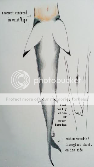I designed my first shark tail and possibly the first one that's actually modeled after real shark tails with vertical flukes. I designed it to be swimable, but please, keep in mind that this design may only be suitable for aesthetic purposes. The swimable version would need to be a lot longer than a typical mer tail so as to allow the feet to be smoothed into the tail so no heel is visible and a longer tail would allow for better propulsion through the water with the minimal movements required to swim side-to-side (the movement would be centered in the hip/waist area of the body). They would require no scales because shark skin appears smooth. The monofin would simply be on its side and would not actually need to be a monofin (as they wouldn't be housing feet) but a mere fiberglass sheet cut into the appropriate shape(s) should do the trick for the fluke and also the additional larger shark fins at the top of the tail could require fiberglass sheets to keep them straight and allow for easy maneuvering through the water. The knees and feet should be thoroughly bound for a more fluid shark-like movement (and to diminish knee pain from swimming unconventionally). The labor that would normally go into making scales would be eliminated and instead, that funding would go into the extra silicone required to make a tail this size and shape. Please, feel free to use this design for your future dream tail, but do not remove my signature ("AR" is for Ashley Rodriguez, my legal name, and the lotus flower is obviously for my mersona, Lotus), and make sure to give me the appropriate credit for my design. (I have the original copies and evidence to copyright the design). Once I have the money to begin making tails myself, I am planning on attempting to make one of my own. Let me know what you guys think! :)