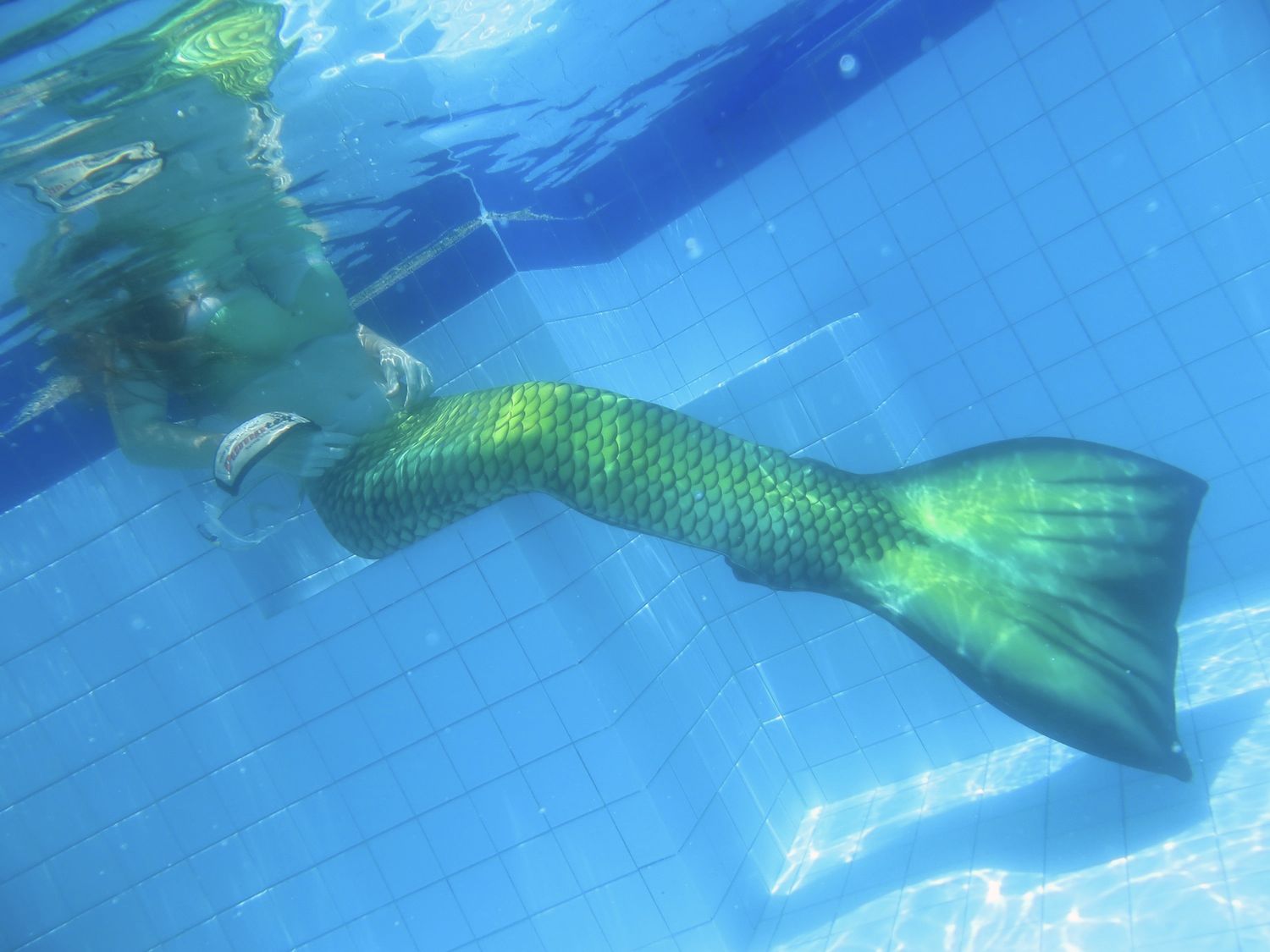 The Green Tail - beautiful in the water, but the fabric we used caused several issues - there was a light film ontop of the fabric to make it a very nice silvery shimmery effect ... when we painted on top it made water even harder to pass through the fabric and as a result the film with the paint on top bubbled and burst my happy tail bubble :( - dont worry its all the learning process ! we have a new fabric now ( blue tail is made of it ) and its working out lovely making my first 2 tails for a customers little girls birthday :D will post pics when done ! - will also post sad pic of burst tail :( xxx
