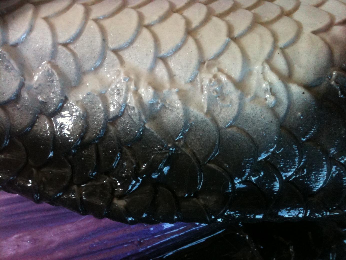 Actually I don't think she can wipe out the inside of hers. She has a strange nylon-looking mesh all on the inside of the scales. Here's a picture she posted. I've heard of people using nylon mesh for strengthening silicone before (for the whole of the tail, or just to reinforce certian areas), but so far it's always imbedded in the silicone, not stuck to the surface. I'm sure Raven has her reasons, but it's a bit puzzling for a few reasons. One of which is that she won't be able to wipe it out or wipe it dry. Unless it dries super fast, drying the inside will be an issue, as will washing the lube and gunk out of the material without hurting the material or the silicone. Silicone is very stretchy, but usually if you put silicone on a less stretchy material it loses that ability to stretch as much, and to get a better fit. I have not felt the material, so I don't know how it will effect the silicone in that way. Just puzzling and concerning. Maybe we should just ask Raven about it, since I obviously don't know what I'm talking about with this stuff :P