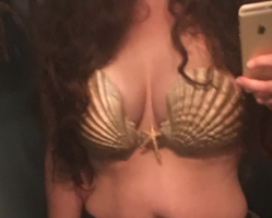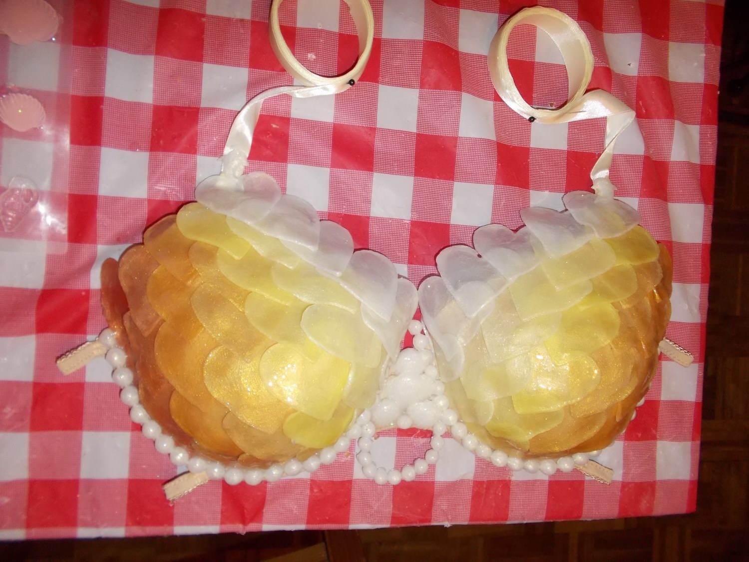 This is my self made she'll top. Bra base with real lions paw and fishnet halter straps. The fishnet tends to cut into my collar bone if I wear it for too long. I prefer shell tops, but am still working on a halter strap design that doesn't cut into the skin. It's a work in progress.