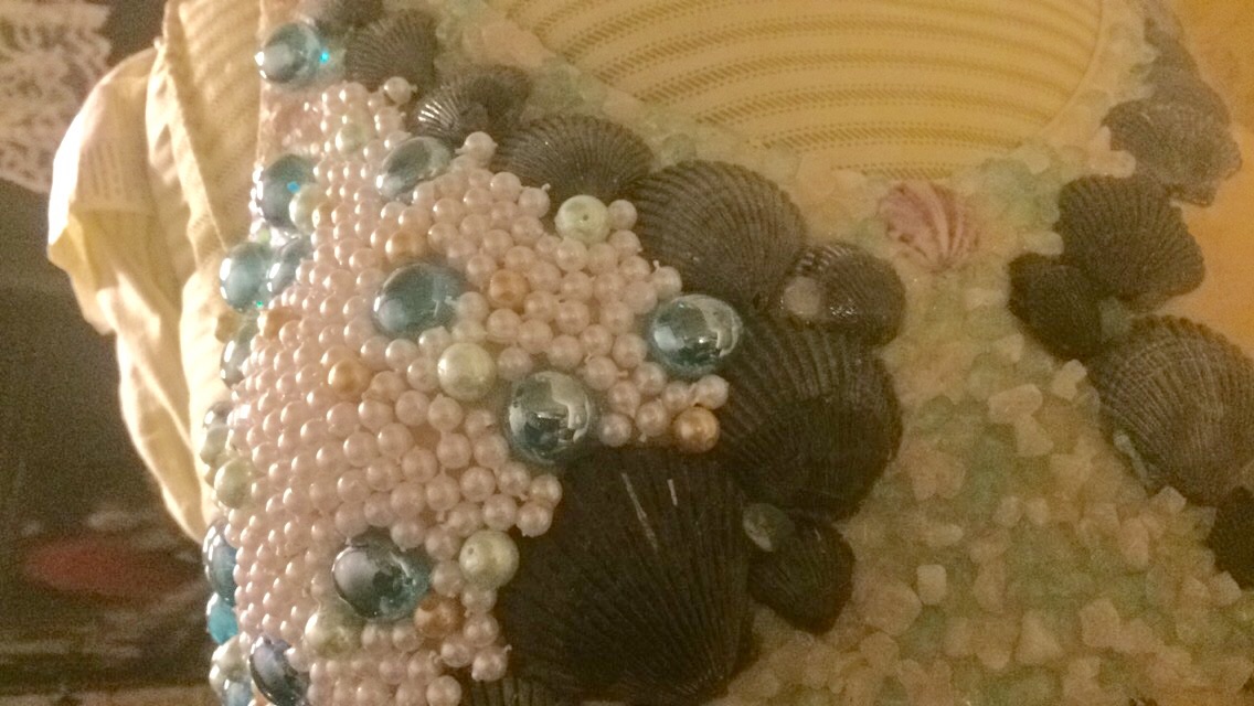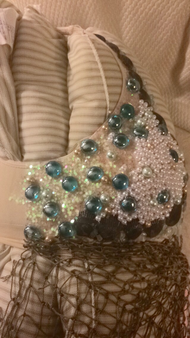 Started my new top the other day and got a lot done on it today! :) I'm using E6000, black scallop shells I found on the beach that I adore and always pick up, sea glass, pearls (white, light blue, and gold), and those aquarium tank bead things (I got the big bag of them for .79 cents at a craft store haha). Oh and this irridescent glitter I found at Walmart that matches my tail!!! :) It looks really cool in person because the bra is tan so when the glue and glitter dries it just looks like irridescent skin! =D So excited to finish this one! :)) We're gonna go get aquarium plants soon for my headpiece and other stuff. ;) <3