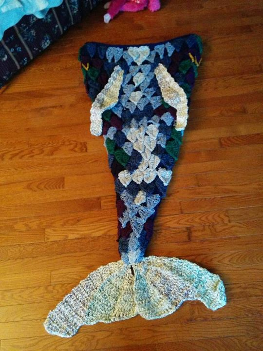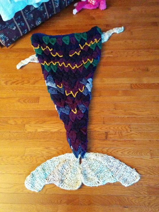 MY OWN CROCHETED MERMAID TAIL BLANKET. With a super soft silky lining and little hippy-fins! ;w; I wasn't expecting anything so detailed and time-consuming, and it's so pretty. It also had pretty good timing, because I'd been complaining to my boyfriend last night about how long it's taking for the waters to start warming up out here, and then the yarn-tail shows up today-- The day we're getting a frost warning. In June. :T SURE DO LOVE NEWFOUNDLAND WEATHER, EH B'Y?
