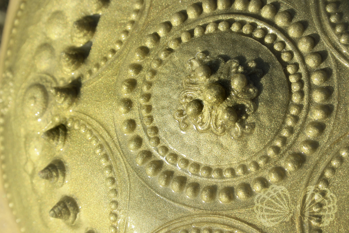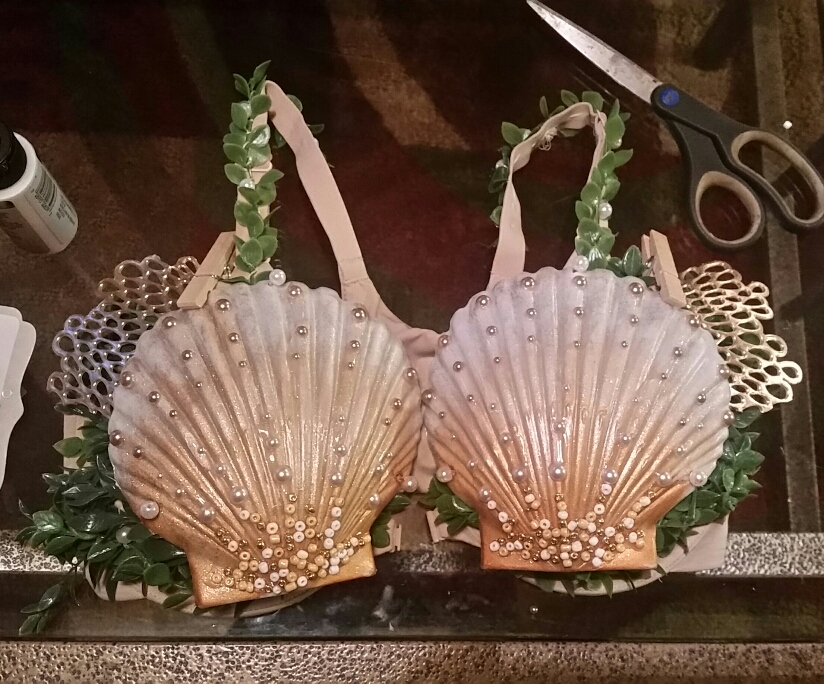 Here it is! It's made with an old bra, aquarium silicone, and some scraps of fishnet, old bellydancing coins, some sequins and shells...