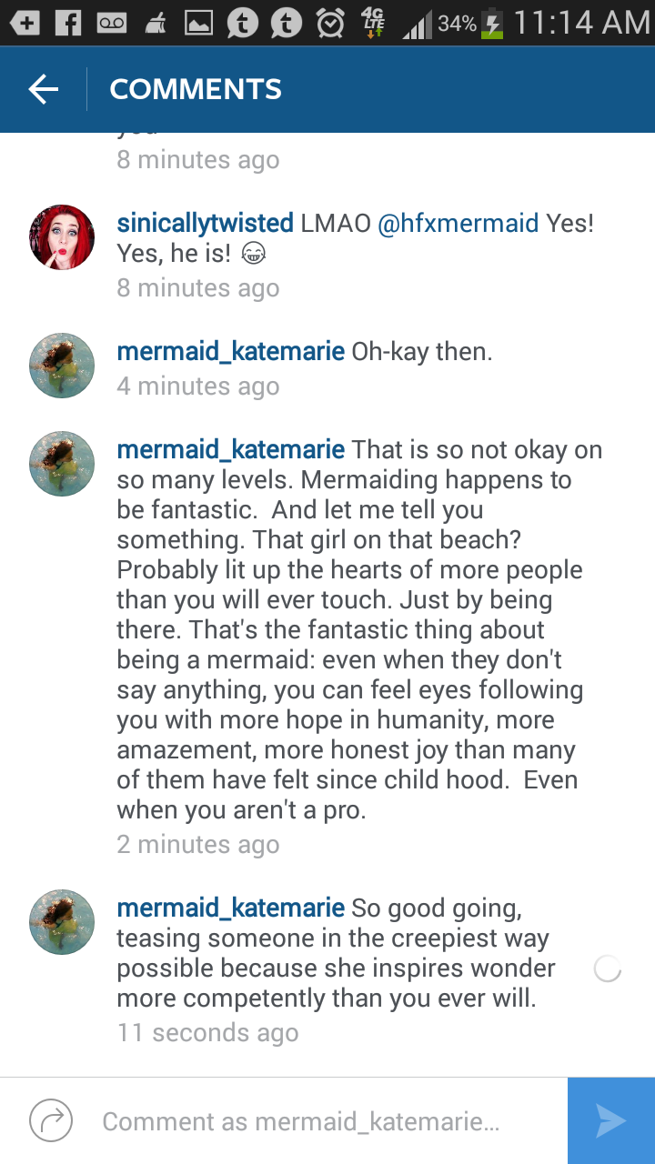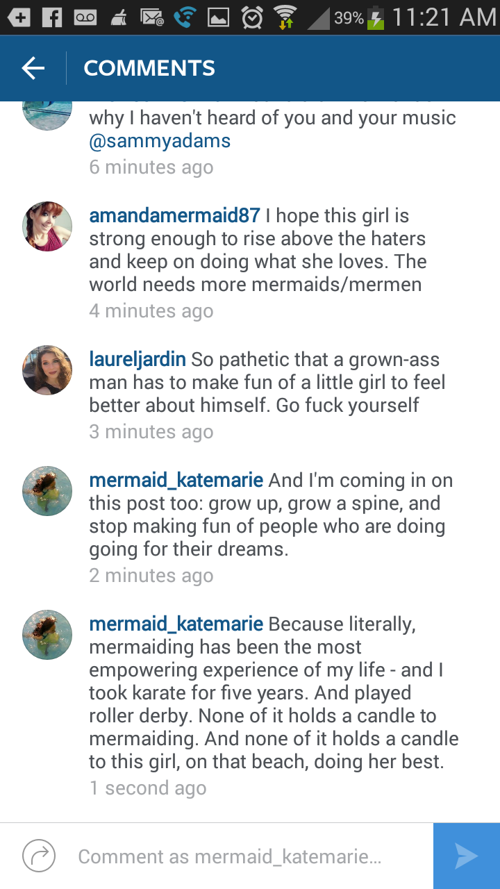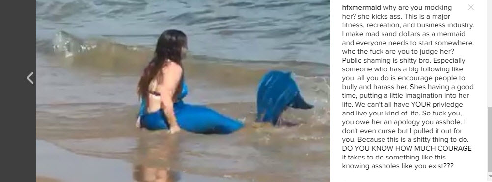 "As someone who is trying to get sales for his music, mocking a beautiful young mermaid enjoying a day at the beach and showing potential future music listeners how much of an ass you are is soooo NOT going to get you any new listeners. If anything it shows people how little you think of other people."