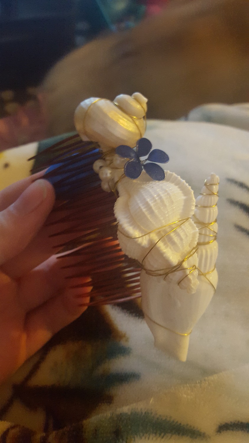 I made this seashell headdress today it kind of reminds me of a mermaid who got stuck in a net and a little piece was still stuck to her head when she got out and a bunch of seashells and starfish got caught on it. It covers my whole head and I love it!