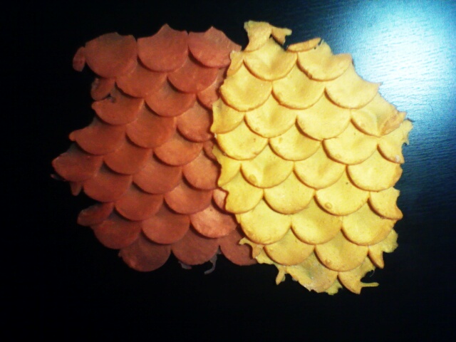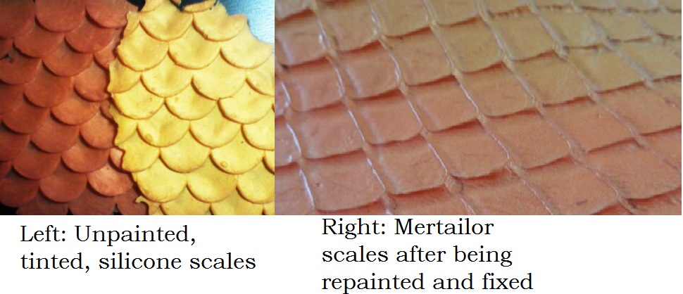 this is a scale swatch for my new tail, these are two pieces of silicone made from a scale mold and tinted. They aren't painted yet. This was a swatch the maker sent to me so I could approve the scale design and tint colours. I wanted something similar to MVD's scales without copying ;)