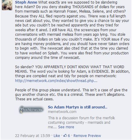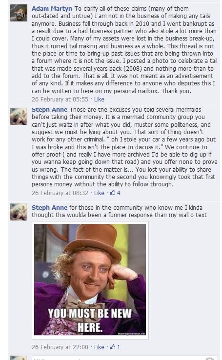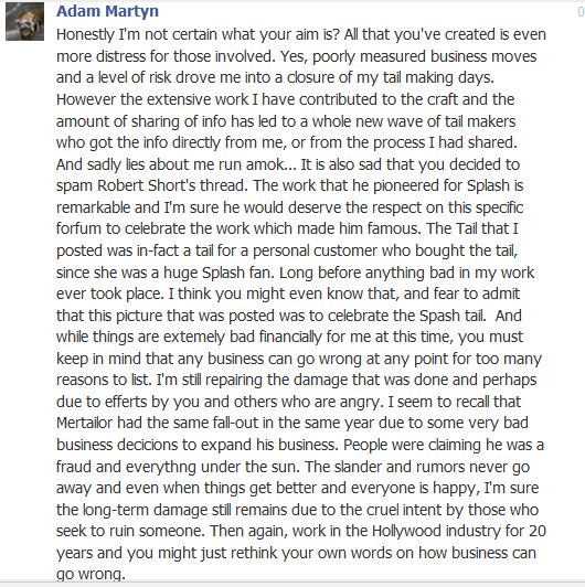Adam Martyn was probably the second pro-tailmaker I had ever heard about (Eric was the first) and incidentally, after I initially stumbled upon his videos for making tails, it was his SCAMMING that I learned about before most of anything else (I'd never found his own website, nothing..). Almost EVERYTHING that came up when I searched him was relating to him being a scumbag and scamming people out of loads of money. Maybe my google-fu is skewed so I saw his scams before anything else about him? But I mean, there's SO MUCH out there about how terrible he is, how can any person, mer or otherwise, who spends even 5 minutes googling NOT come across that he stole tens of thousands of dollars from others? It really irks me that he's trying to scam people again because he thinks he's laid low enough for everyone to forget, that's seriously f*cked up.