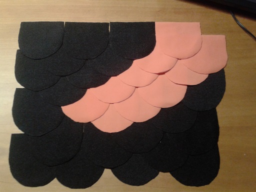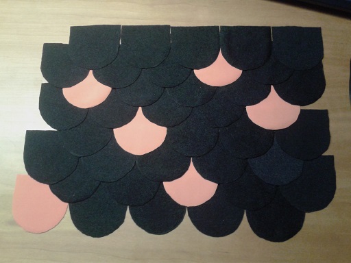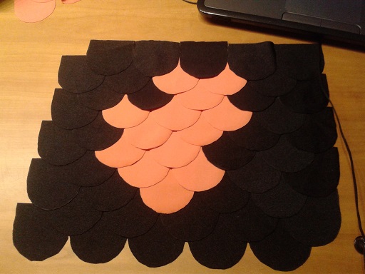 I have made some progress on the scales. I calculated that need around 400 scales to cover the tail and so far I've cut 179 scales. 99 black, 80 orange and I can cut another 50 scales from the orange fabric piece, which leaves me with cutting another 271 from the black fabric.