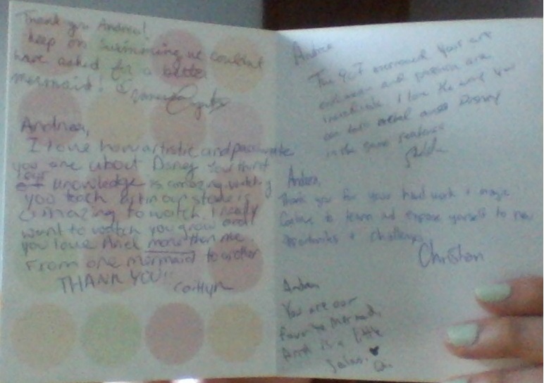 2) I love how artistic and passionate you are about Disney. Your thirst for knowledge is amazing. watching you teach art in our tore is amazing to watch. i really want to watch you grow and you love ariel more than me. From one mermaid to another, thankyou!