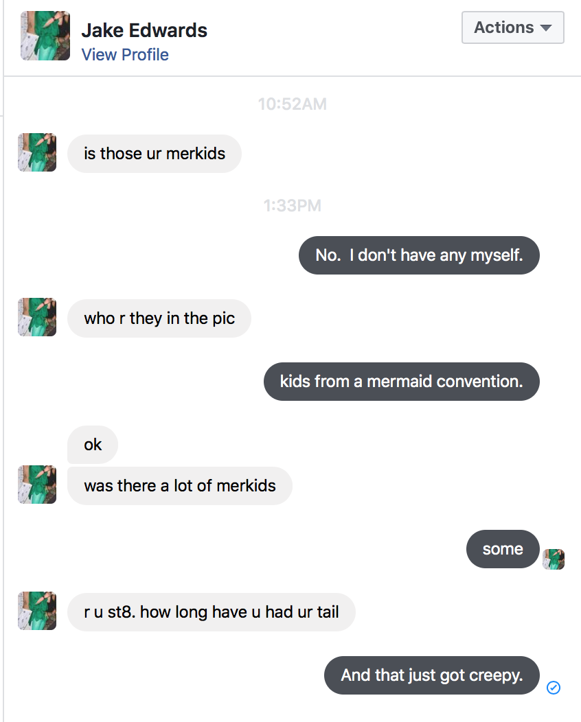 Man, I'm happy I don't get those messages often. There's the standard hey and that gets spammed and that one guy who seemed to troll me asking for a tail. Other than that, I think I'm good. I also recently got a message from someone I have blocked on my personal account saying a picture I shared looked nice in a pm on Facebook. I can't remember why I blocked him and I'm nervous about engaging with him. I blocked him for a reason, but when I deleted my previous meraccount I lost all my evidence.