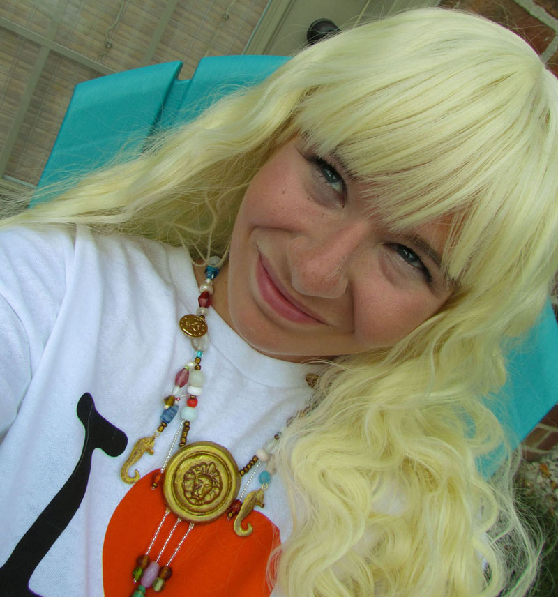 You guessed it! :) My actual hair is dyed blonde, too, and I thought it might be long enough by Halloween that I could go without a wig, but a few days ago I had to have several inches of hair cut off after the ends turned blue (chlorine + purple shampoo is not a good combo ROFL). I just ended up getting a nice wig instead- at least I don't have to worry about taking the time to crimp my real hair. You will definitely have to post pics of your genie costume- I bet it will look amazing! I love the idea of a bedazzled bottle! :D