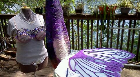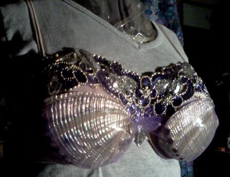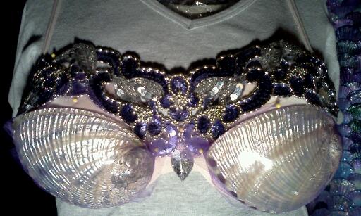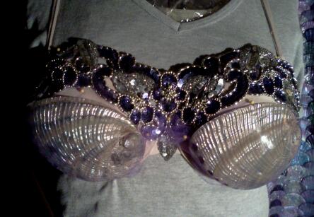 I had a little setback with the prototype monofin today, nothing major, so while I was pondering a solution, I kept my hand busy working on a shell top, with some beads and sequins...a work in progress and far from finished. My modest bust is going to look HUGE!