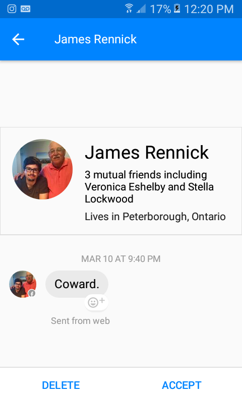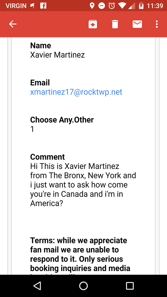 He's been sending my company email weird emails about how he lives in new york and why don't we live in canada etc. I have been ignoring him and he bombarded my pages and youtube which is why I thought he was a kid.