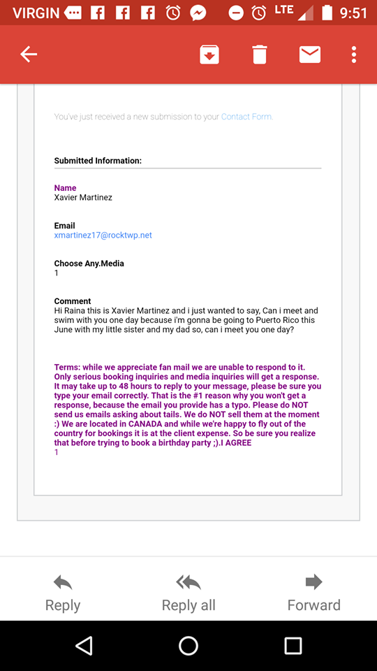 That man has harassed me on all my accounts and has made so many fake accounts, he continually tried to book me for parties that are non existent and also has harassed my girl venilia as well. He got me so upset one day after i was in the hospital and wanted more info to where I was in the hospital. I blocked him. Im tired of him Im sorry this is a grown ass man trying to book for 1 guest and after i told him i refuse to do one on one parties without my mertender and stopped doing adult parties he got outright upset at me because he wanted to swim with me and take photos of me . He started getting really creepy after he contacted me on my facebook page. I have a ton of screenshots i got to shrink and compress them cause there's a bunch.