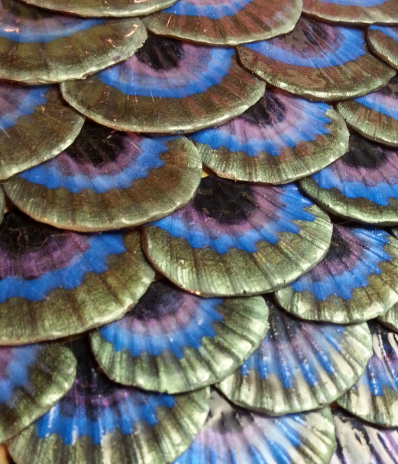 I'm not sure how an entire tail would look with the eye feathers completely covering it, but I think if the peacock eye feathers were scattered in among green and some bright blue scales, it could be quite striking. Maybe the blue scales could start where the legs start to taper into the ankles, to echo the look of a peacock's neck.