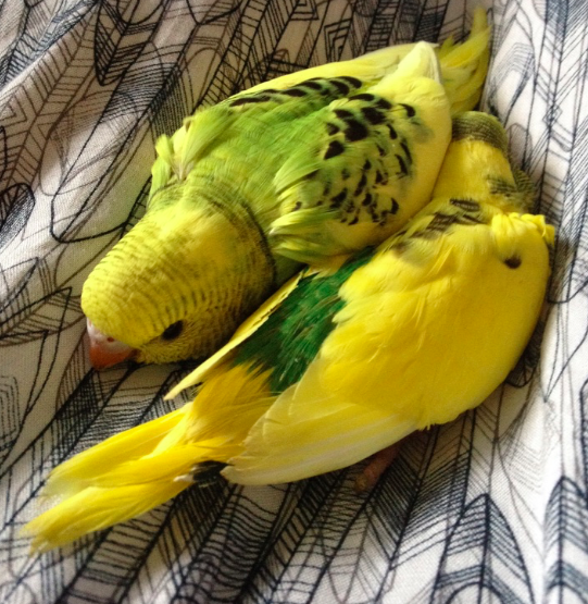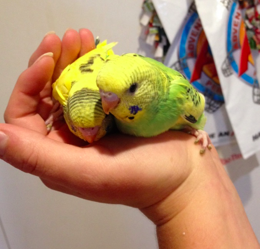Not mer related, but I present to you my baby budgies! In the first pic, they are cuddling up to me for warmth :) We've got 10 budgies now and a big cage for them :) Just a few piccies I took with my iPhone 4s.