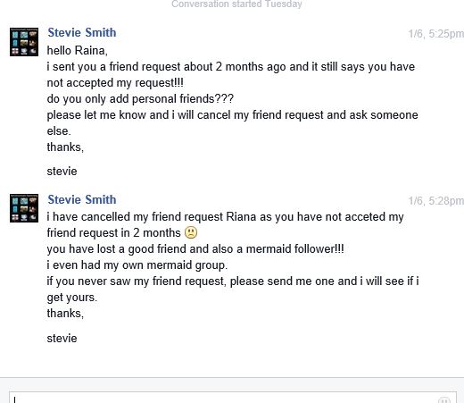 Another hit on Stevie Smith here! He sent me a friend request, a poke and a msg asking if we could be friends and after I told him that my facebook is for friends and family only he got all funny about it and has banned me from the mermaids are the best group. Here's screenshots: