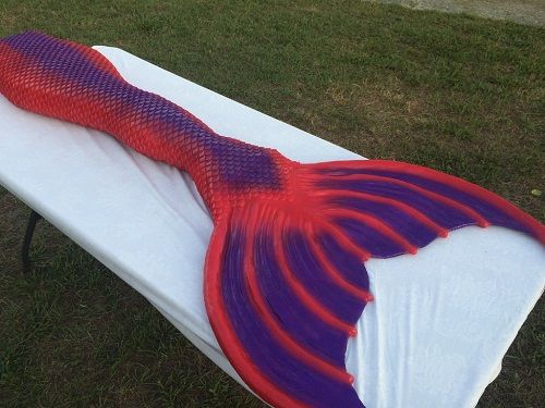So I didn't learn until after I bought this fabric that the color comes off and turns silver, but I think it just makes it look cooler! I hand painted the fin, and used finfun's new monofin. I think it turned out pretty well being my first sewing project without my mom's help. haha I'll be making my friend's tail next!