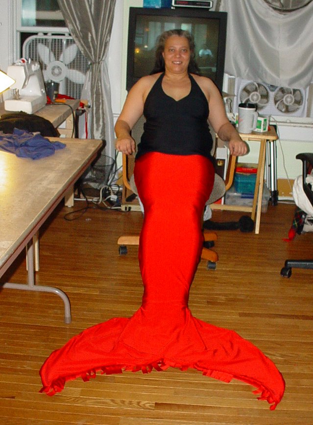 Excuse the wonky mirror- the mirror is brown and distorted, but its the only full length mirror I have. I traced my Finfun tail for the "body," then made a circle skirt for the "fins," which i have to shorten a bit. Not bad for thirty dollars and two hours work!